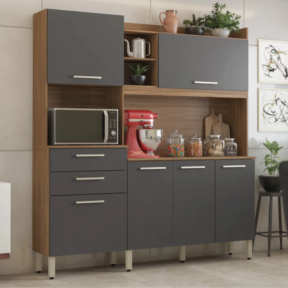 Com um amplo espaço interno, possui prateleiras para melhor organização de alimentos, copos, pratos, vasilhas, panelas e os demais objetos que desejar. Sem contar com seu espaço externo que pode acomodar micro-ondas ou forno elétrico de bancada vem com pés com regulador de altura.