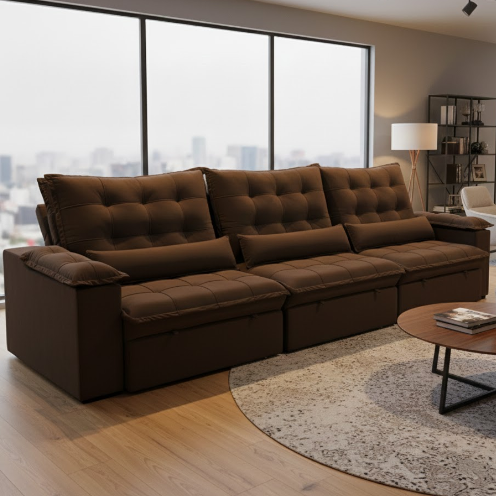 Com um excelente Conforto e acabamento de primeira qualidade, o sofá Calvin retrátil e reclinável é um sofá mega confortável, macio com molas ensacadas nos assentos,e mais tem o sistema Duplo molejo sendo a primeira camada conforto com pilloe top de 20 cm com molas ensacadas de alta qualidade, e na parte de baixo vem mais uma camada de molas em aspiral de altaissima resistência dando uma durabilidade gigante ao seu estofafo Calvin, além disso conta com fibra siliconada nos encostos e nos braços, todo o tecido vem com costura Dupla evitando descosturas e desgates nas quinas, vem com Pistão de aço no retratil promovendo um deslizar suave e maior duaribilidade no estofado e evitando o efeito travar na hora de puxar seu retrátil, na parte de baixo vem com rodízios nos retráteis para não gerar atrito no piso, tecido macio aveludado com acabamento de altíssimo padrão e acompanha 3 almofadas soltas.