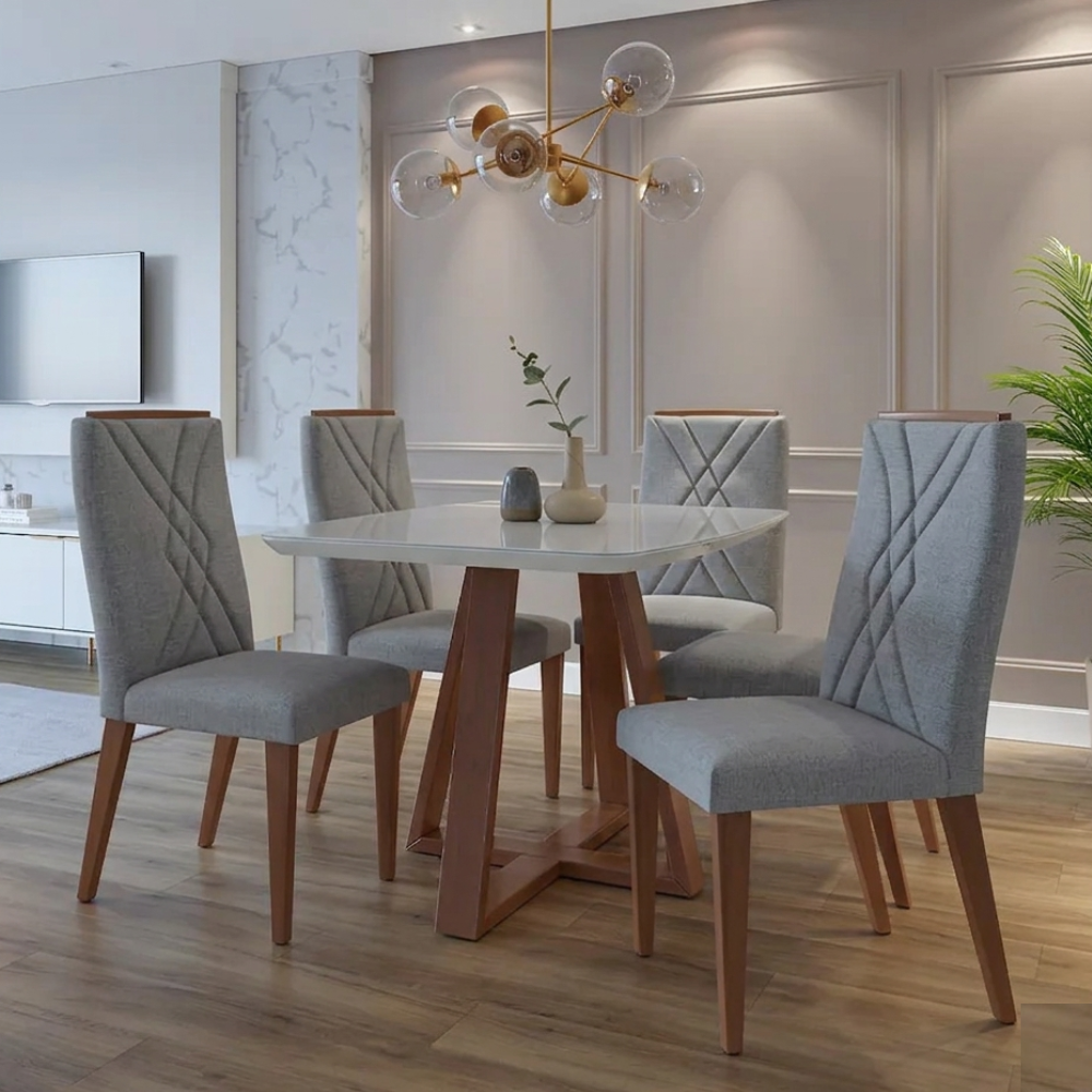 A mesa de jantar Bennet é uma peça imponente e elegante para sua sala de jantar. Com suas meidas de 115x90 cm, oferece espaço para acomodar até quatro pessoas confortavelmente. Feita de madeira maciça, tanto nas cadeiras quanto na base, a mesa transmite durabilidade e robustez. As cadeiras Megan, também de madeira maciça, proporcionam um toque de charme e sofisticação. Com revestimento em tecido linho bege e acabamento bordado, oferecem um conforto excepcional. O tampo em vidro e as quinas arredondadas e laqueadas da mesa Bennet adicionam um toque contemporâneo ao conjunto. Com sua estrutura em madeira maciça, este conjunto é uma escolha perfeita para criar uma sala de jantar elegante e acolhedora.