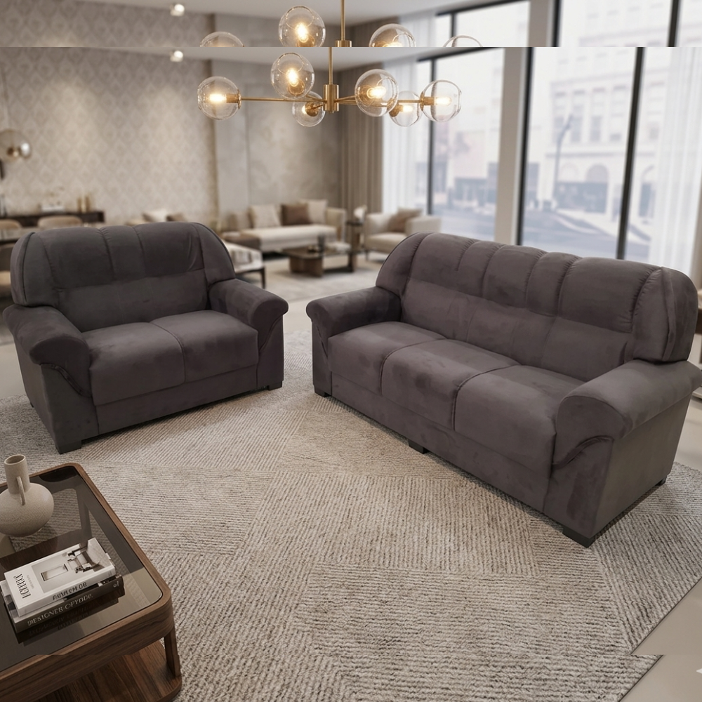 O sofá Miame de 3 e 2 lugares da Estofados Imperial é uma opção elegante e confortável para a sala de estar. Com um design clássico, possui pés que garantem estabilidade e durabilidade. O tecido aveludado confere um toque de sofisticação, enquanto o enchimento siliconado no encosto proporciona um apoio macio e confortável. Comportando até 5 pessoas com conforto, é ideal para receber amigos e familiares. A estrutura do sofá é feita de madeira tratada, assegurando resistência e qualidade.