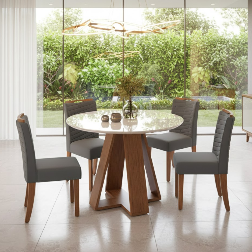 Não podemos esquecer que esta mesa ainda te possibilita guardar as cadeiras embaixo do tampo, otimizando o espaço da sua sala de jantar e facilitando a limpeza. O tampo possui vidro pintado aplicado na madeira, aumentando a durabilidade do produto e tornando a limpeza mais fácil e prática. Além disso, os cantos são arredondados, tornando sua sala de estar mais segura.
