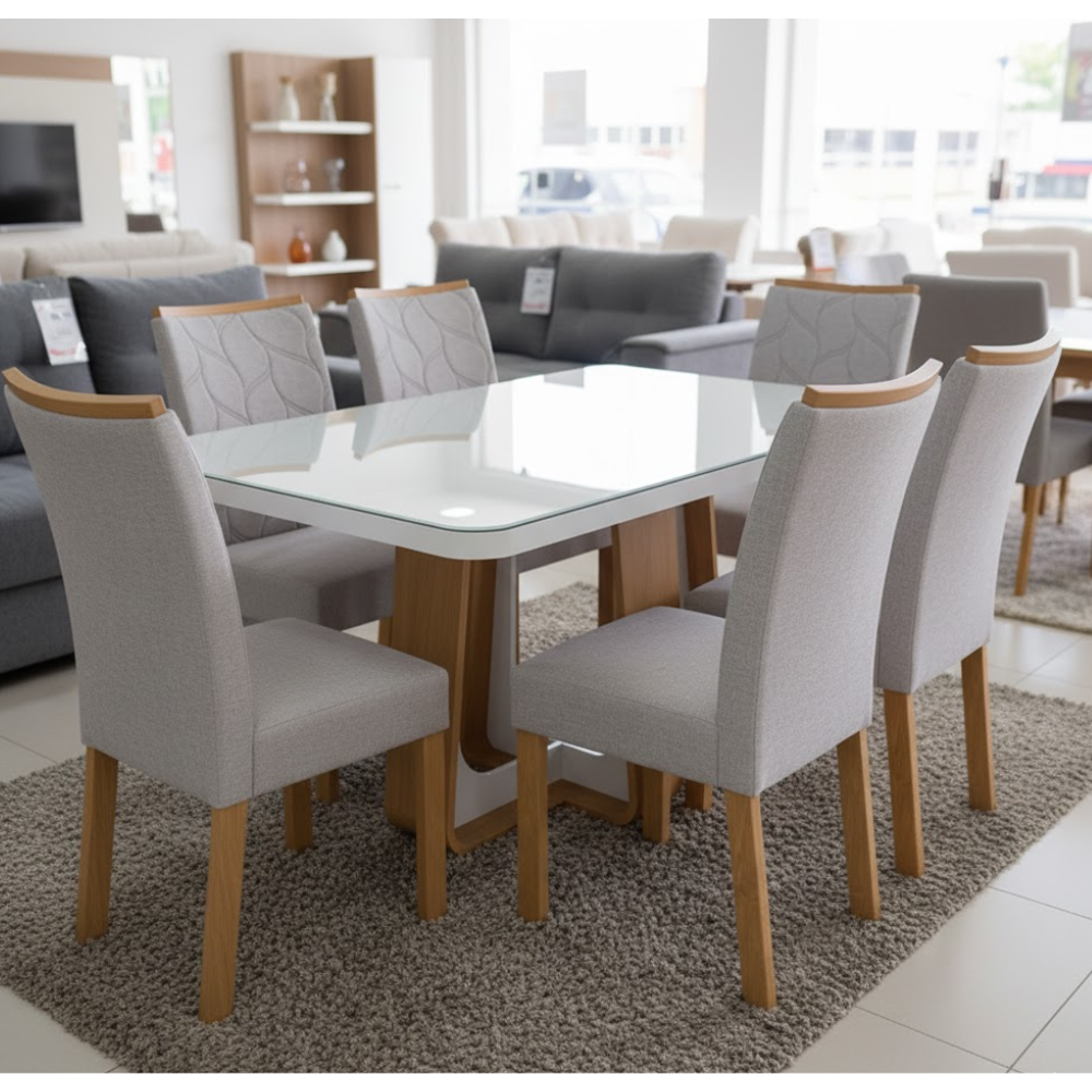 O Conjunto Mesa Sintonia com 6 Cadeiras Rayla, da marca Lopas, é a escolha ideal para quem busca um ambiente sofisticado, acolhedor e moderno.